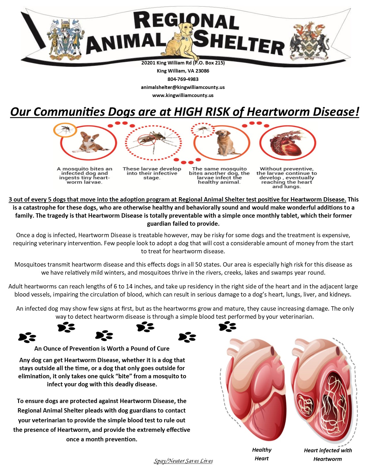 The Regional Animal Shelter (RAS) is a municipal facility that provides for the care and welfare of displaced animals from King William and King and Queen Counties. The RAS assists citizens of our community with a wide range of services such as: